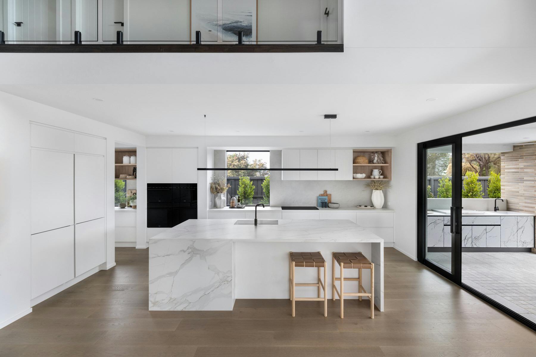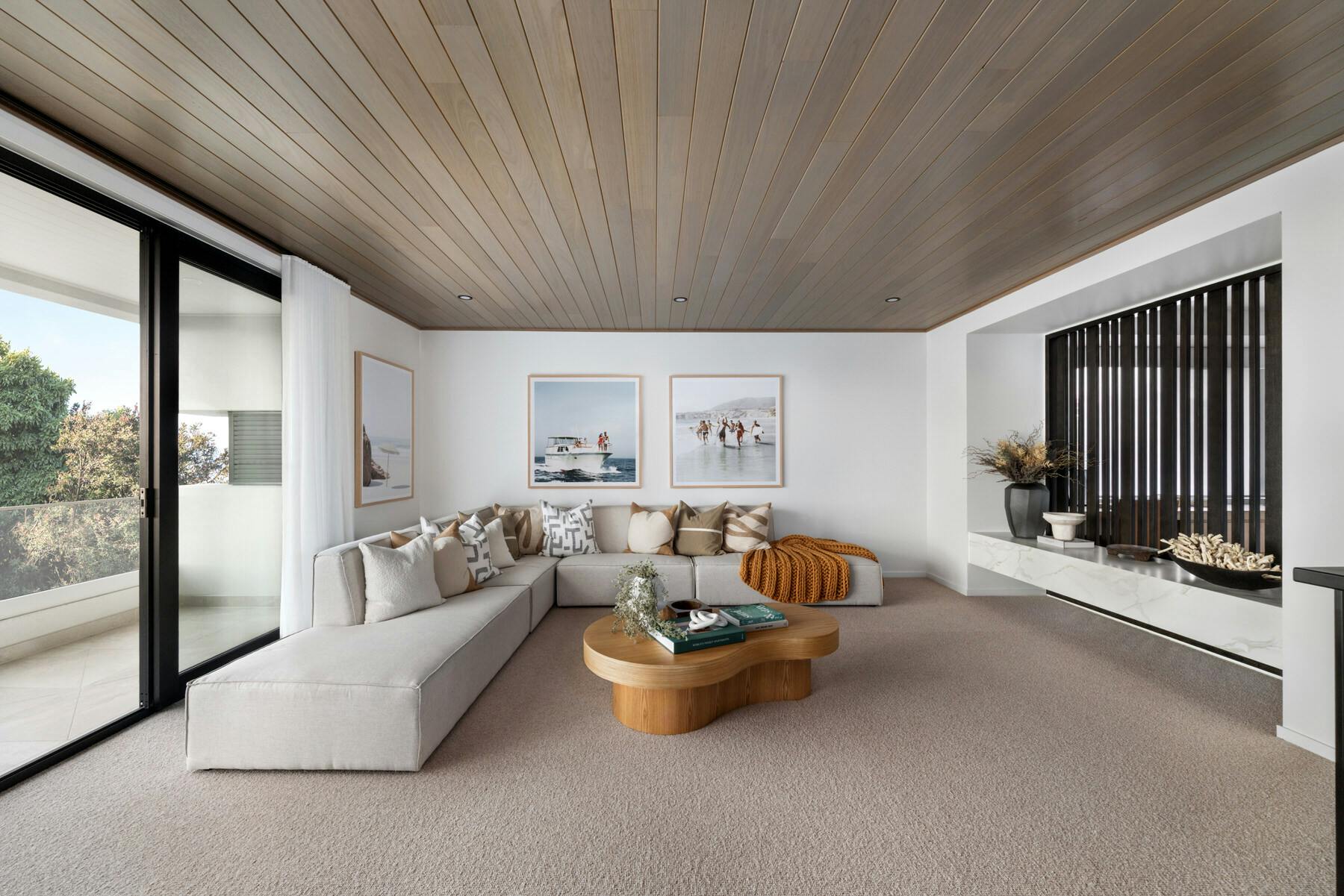 That open-plan living area is the true heart of the home, showcasing a wine room, dramatic void, timber-lined ceilings, and pendant lighting. “It’s all about creating that sense of scale and indulgence, balanced with clever joinery and functional touches,” he says.