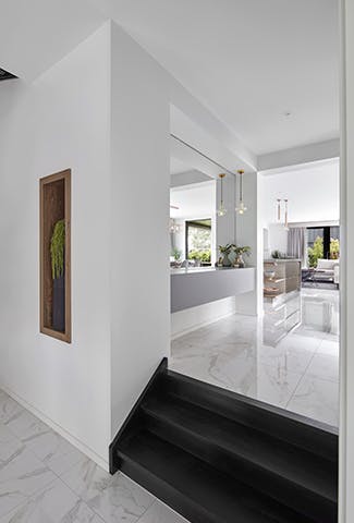 “We had to redesign the home to accommodate the split levels,” Ricky explains. “Instead of stepping into the home and having a series of steps down right after the entry – as is the case in many sloping block designs – the aim with the Botanica was to bring it down in levels across the living areas gently.”